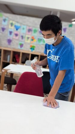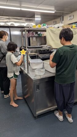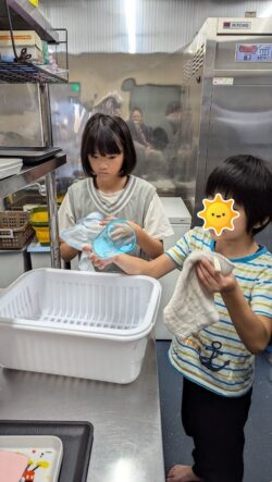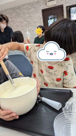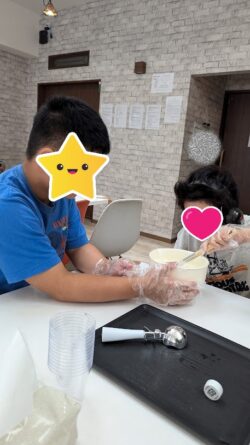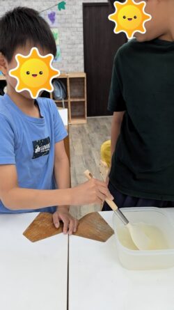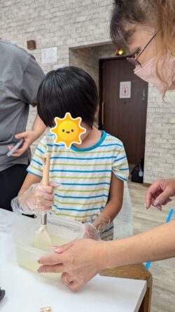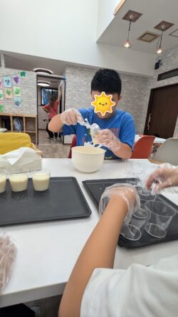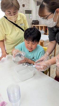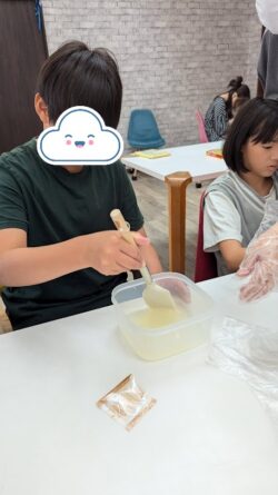 水とゼラチンが入った容器をみんなで協力してまぜまぜ😄