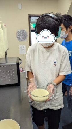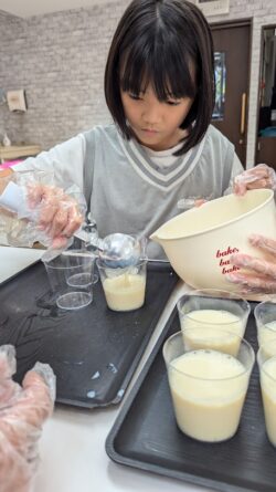 みんなが混ぜてくれた豆乳を、カップに慎重に入れていきます!