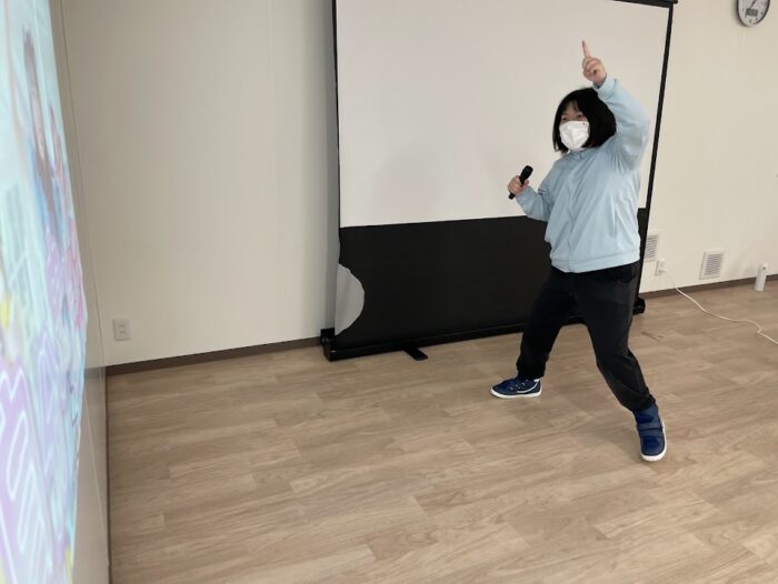 シアターの前に出て、十八番を堂々と歌い上げるご利用者様!