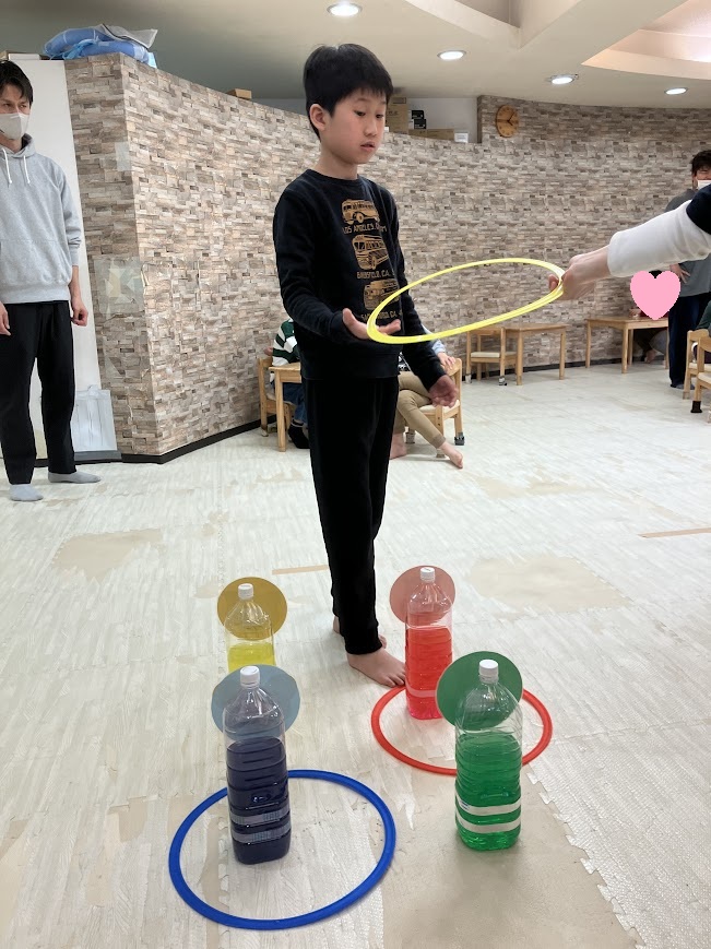 色水の入ったペットボトルに同じ色の輪を投げていきます✨