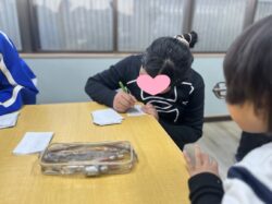 しりとりの単語を書きます✏️ 次に、走って紐にぶら下がってる洗濯ばさみに紙を挟みます。