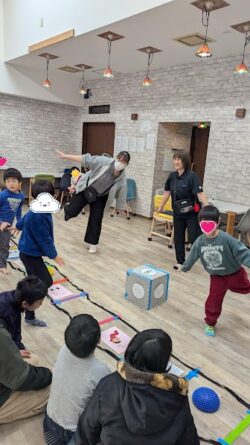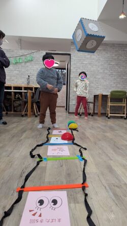 4~5人の赤、青、黄、緑の4チームに分かれて、サイコロ🎲の目だけ進み、コマが止まった所の指示に従って運動しました。