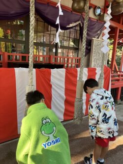 神社に行く前に、お参りの仕方、二拝二拍手一拝を練習して行きました。