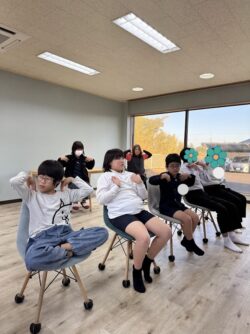 ⑨腕を後ろに回して椅子を掴み、体を前に倒して両足を前後に動かします。