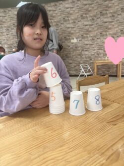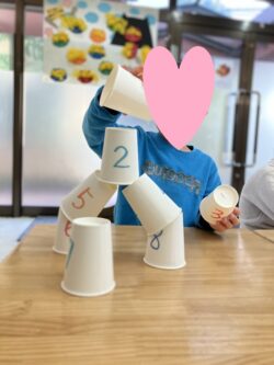 番号順にコップを使って物づくりをしながら、お友達が頑張って積み上げてる所を応援しよう👍