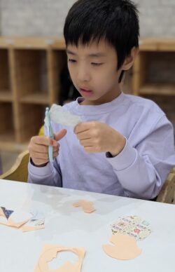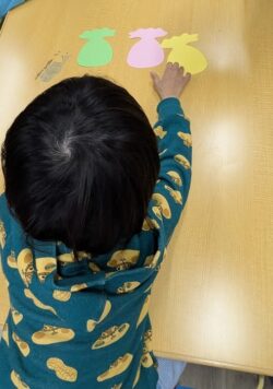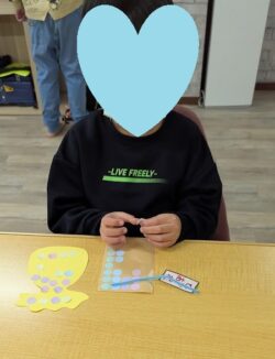 「この色にしようかな」「ここに貼る?」と考えて取り組んでいました。