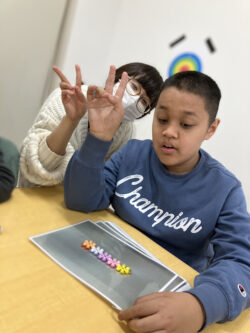 お花ブロックを使って見本と同じ形を作れるかチャレンジし、
