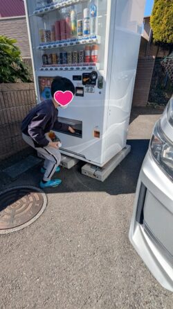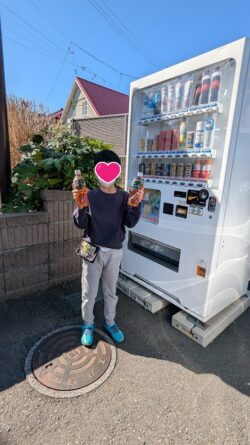 大こくやさんのために自動販売機でお茶を買い、実際にお渡ししました。